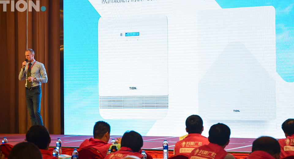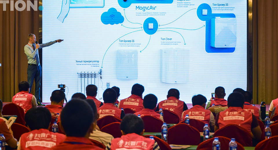 В минувший четверг в Пекине состоялась презентация наших новинок 2017 года. Генеральный директор китайского филиала “Тион” Антон Центалович представил вниманию представителей бизнеса Tion Бризер 3S и систему умного микроклимата MagicAir.